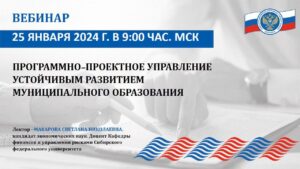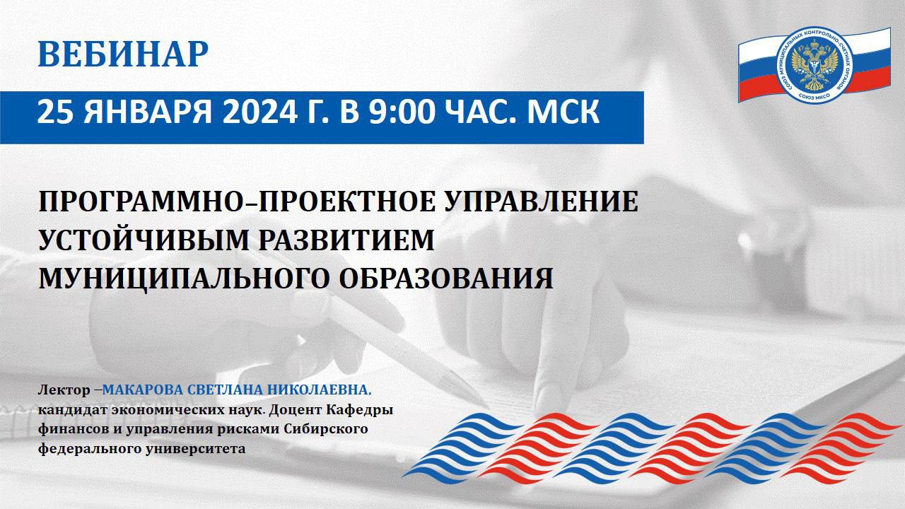 Вебинар Союза муниципальных контрольно-счетных органов «Программно-проектное управление устойчивым развитием муниципального образования» состоялся 25 января 2024 года в режиме видеоконференцсвязи. Лектором мероприятия выступила доцент кафедры финансов и управления рисками Сибирского федерального университета, кандидат экономических наук Светлана Макарова.
