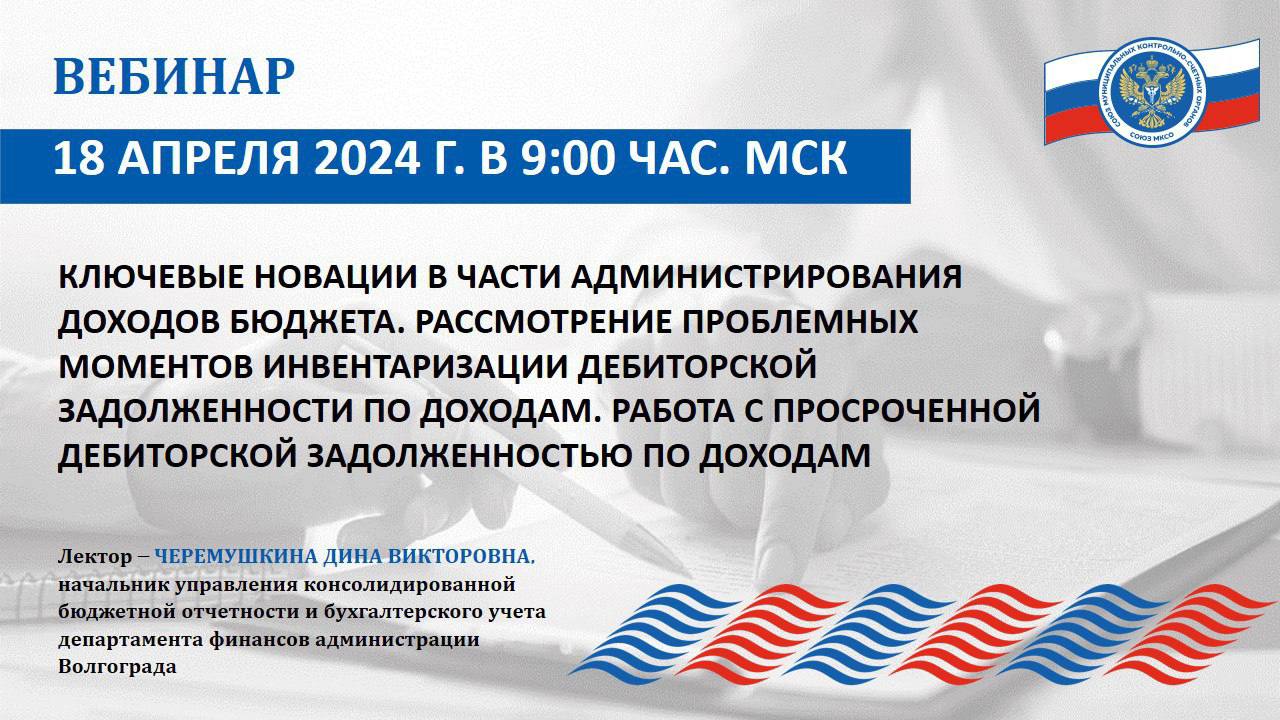 Вебинар на тему «Ключевые новации в части администрирования доходов бюджета. Рассмотрение проблемных моментов инвентаризации дебиторской задолженности по доходам. Работа с просроченной дебиторской задолженностью по доходам» состоялся 18 апреля 2024 года в режиме видеоконференцсвязи.
