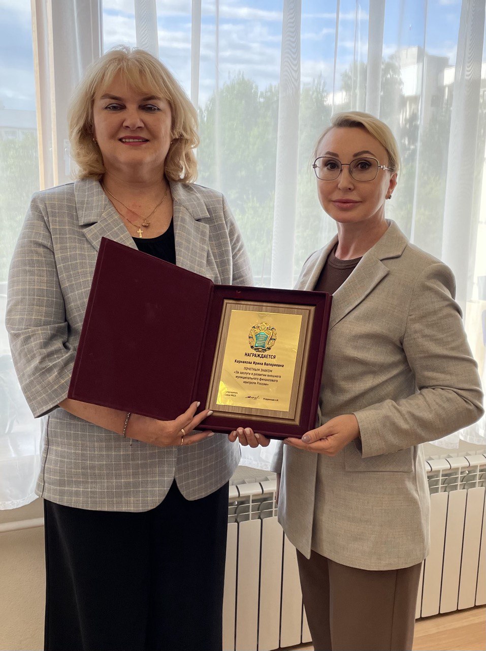 25 июня 2024 года Председатель Контрольно-счетной палаты города Вологды, Председатель Представительства Союза муниципальных контрольно-счетных органов в Северо-Западном федеральном округе Данилова Ирина Валерьевна в торжественной обстановке вручила Председателю Контрольно-счетной палаты Вологодской области Карнаковой Ирине Валериевне Почетный Знак Союза муниципальных контрольно-счетных органов «За заслуги в развитии внешнего муниципального финансового контроля России».